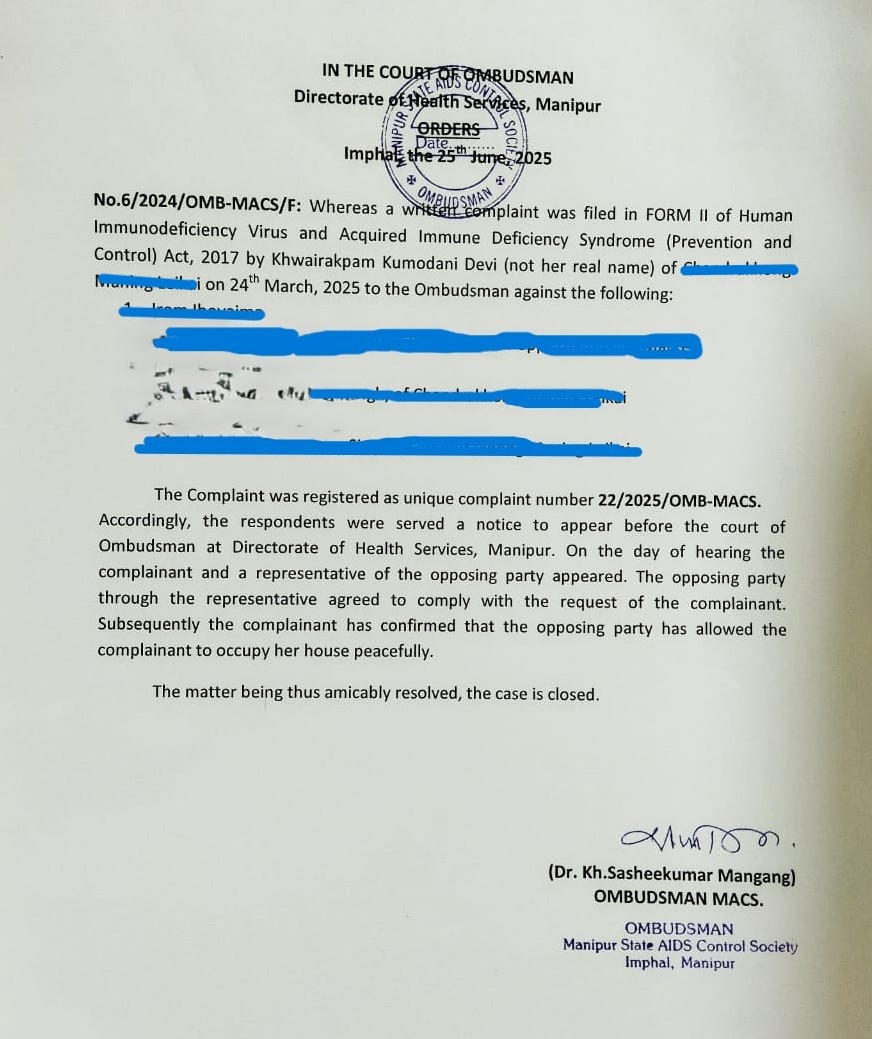 After due efforts by the Ombudsmen and brining the women and her in-laws in a common discussion platform, the women living with HIV now has been given access to her home and the case has been resolved and closed on 25 June 2025.